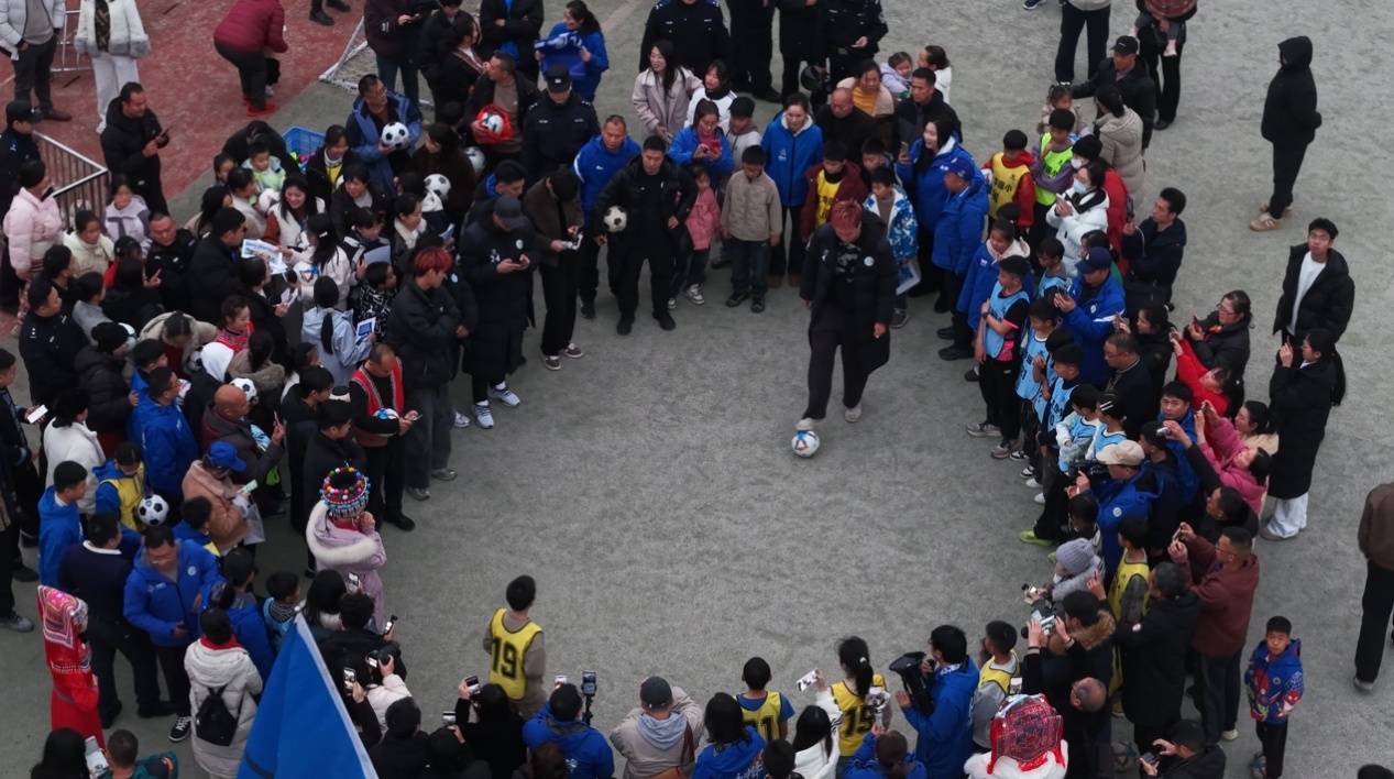 在江华瑶族自治县瑶族小学,队员们化身“足球教练”,与孩子们开展趣味足球互动,教孩子们传球等基础动作,燃起学生对足球的热爱与向往。